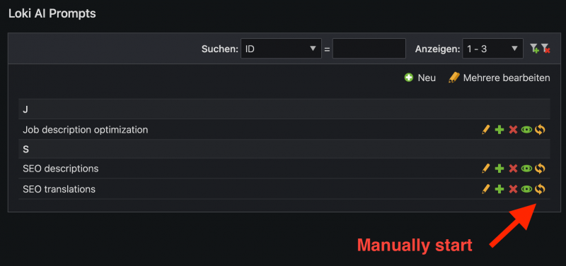 Du kannst jeden Prompt auch manuell starten. Dabei werden alle Datensätze dieses Prompts bearbeitet, auch die, bei denen das Zielfeld nicht leer ist.