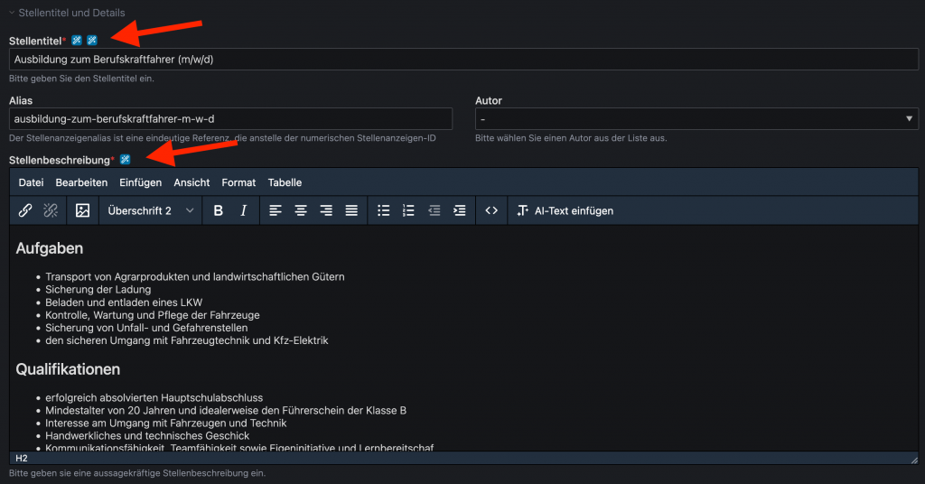 Eingebundene Felder: Bestimme hier, welche Felder in den Prompt eingebunden werden. Die Werte dieser Felder kann die KI später bei der Generierung nutzen.